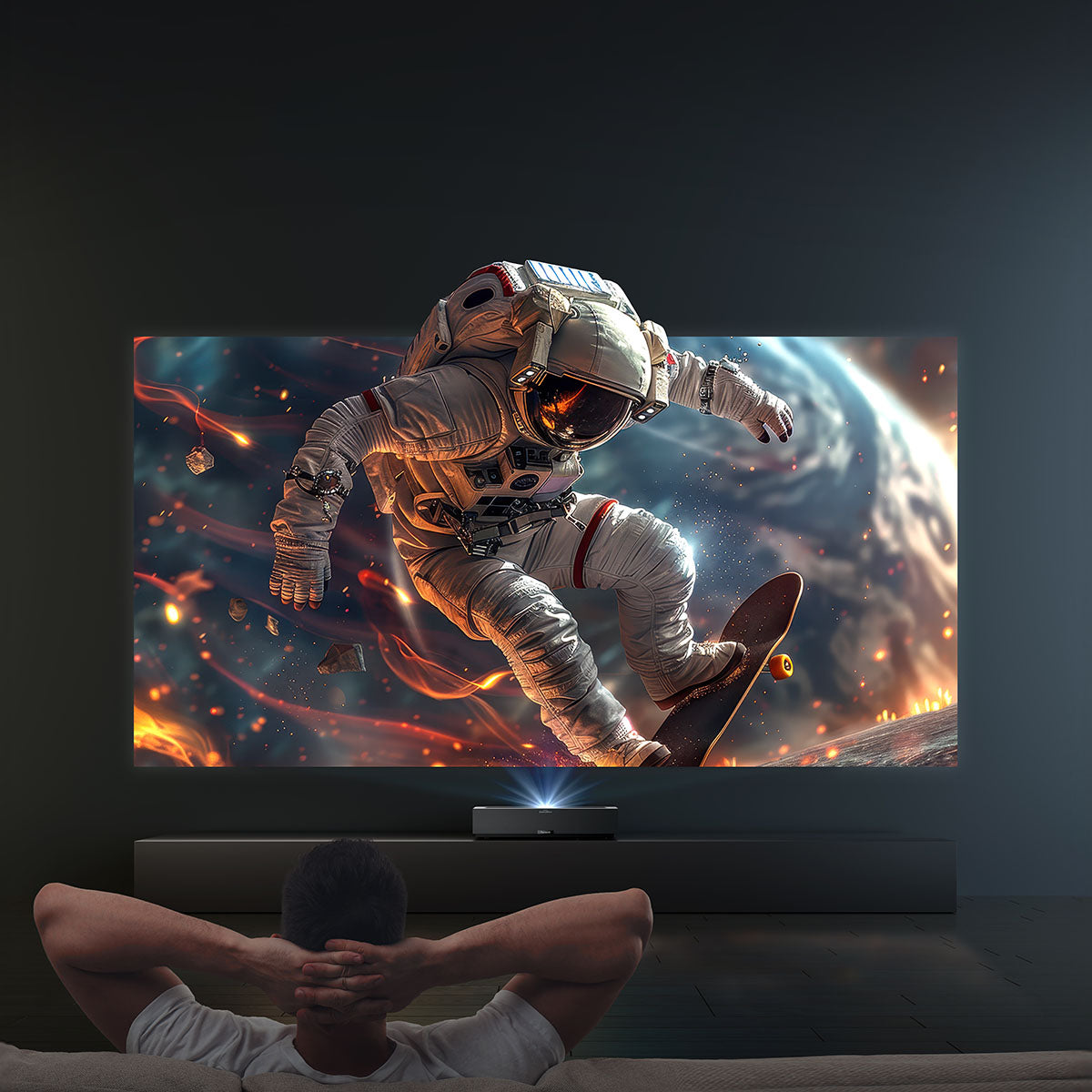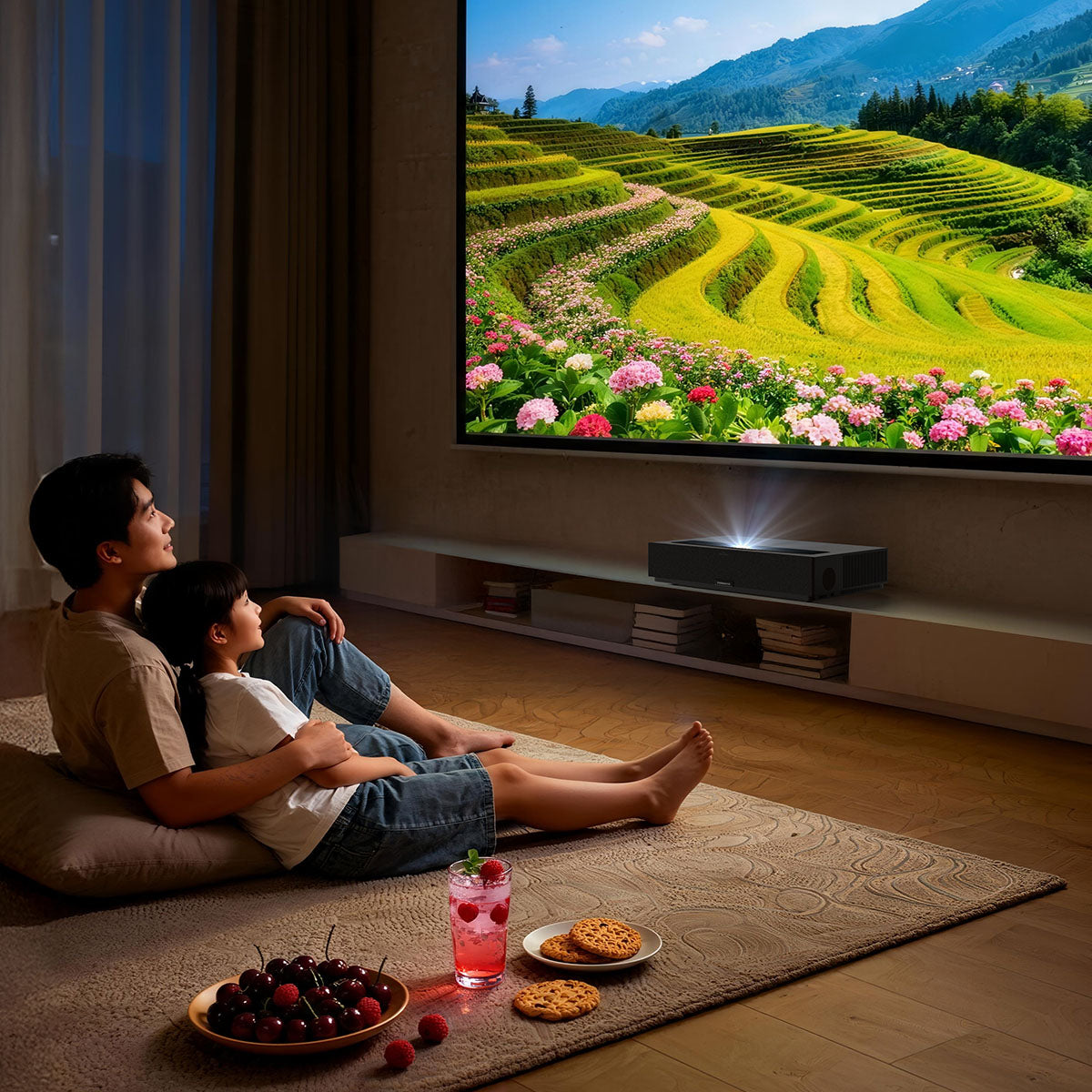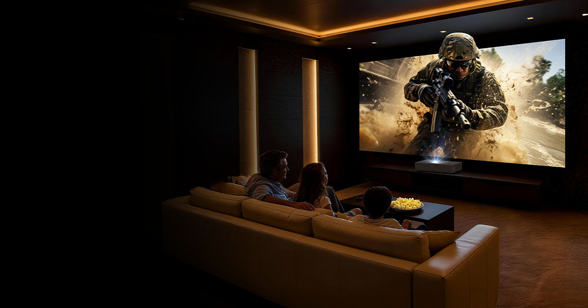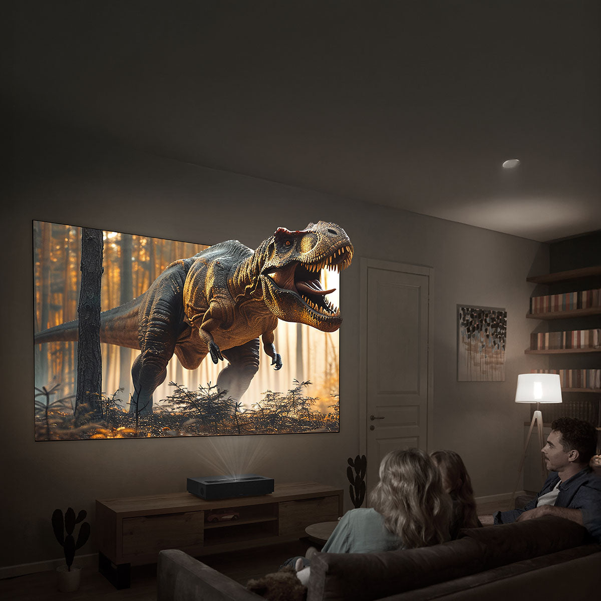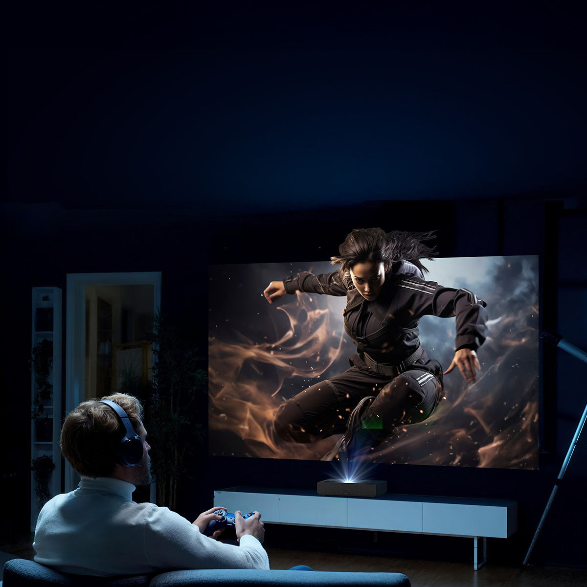 “Transform any room into a personal cinema with 4K clarity, vibrant factory-calibrated colors, and 2200 ISO Lumens brightness. ALPD RGB+ 4.0 ensures smooth, natural visuals for an immersive experience.”