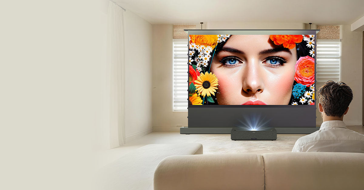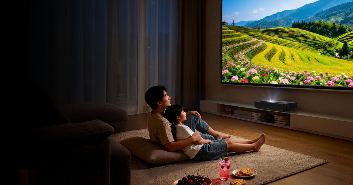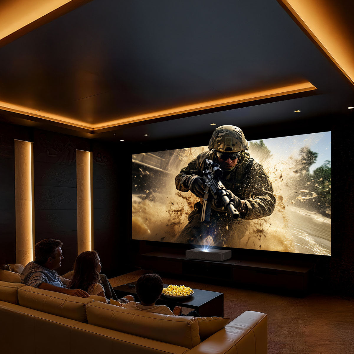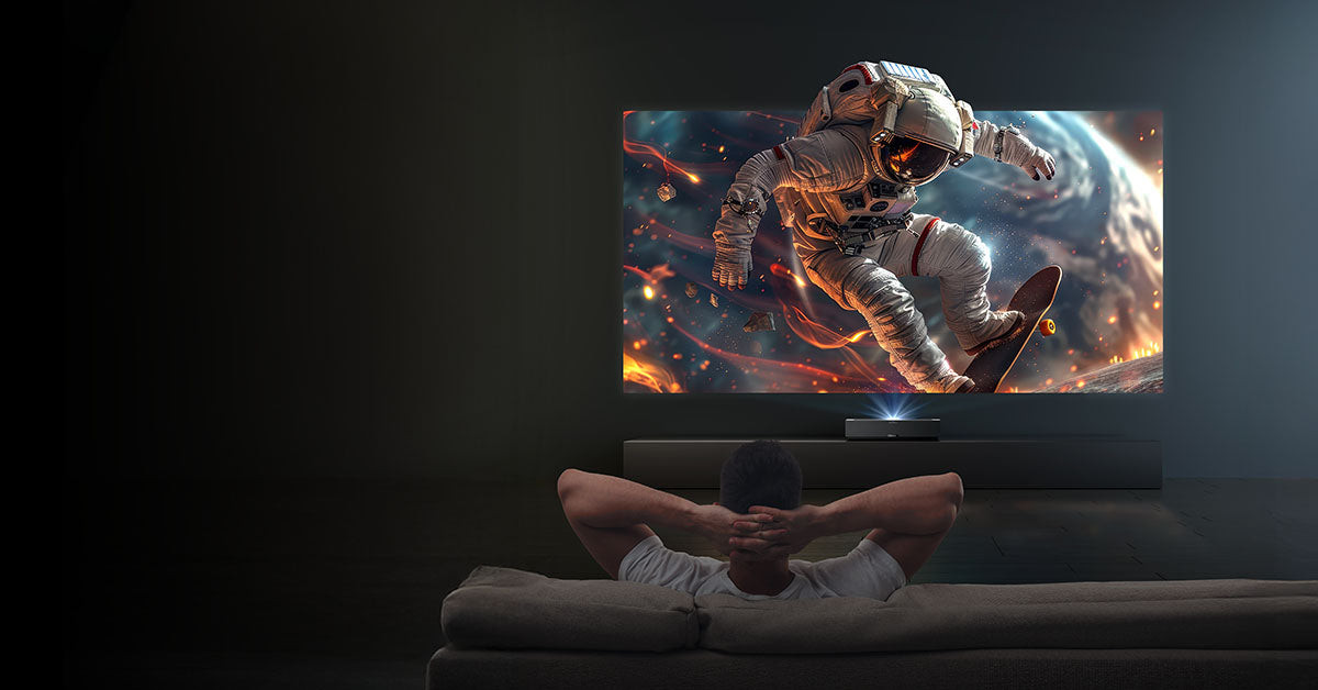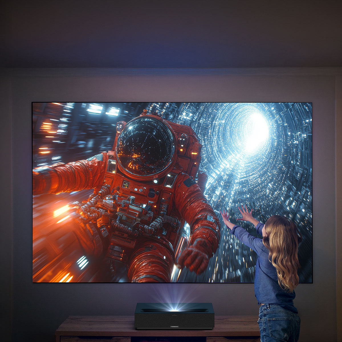 “Transform any room into a personal cinema with 4K clarity, vibrant factory-calibrated colors, and 2200 ISO Lumens brightness. ALPD RGB+ 4.0 ensures smooth, natural visuals for an immersive experience.”