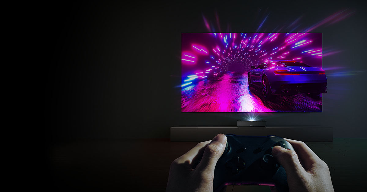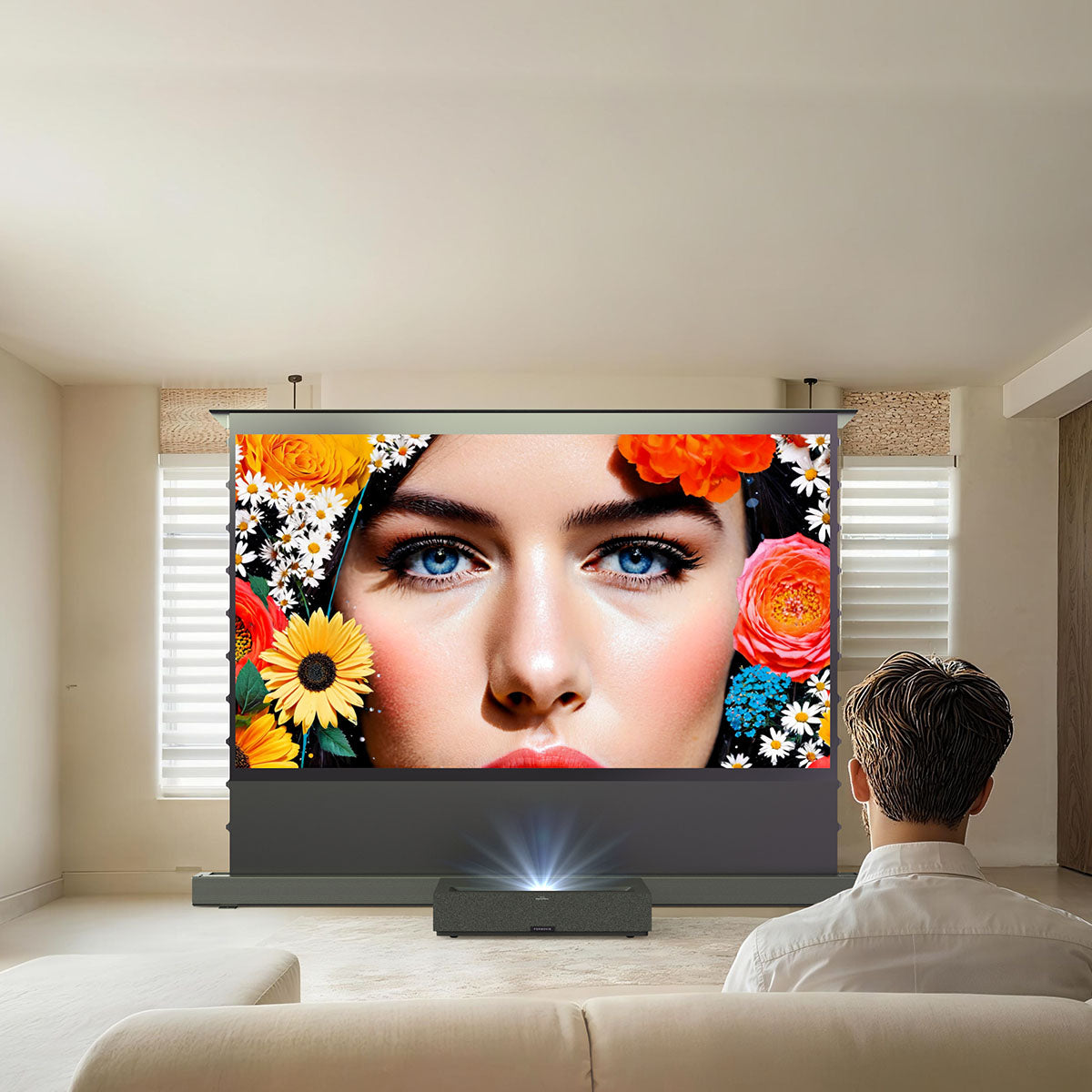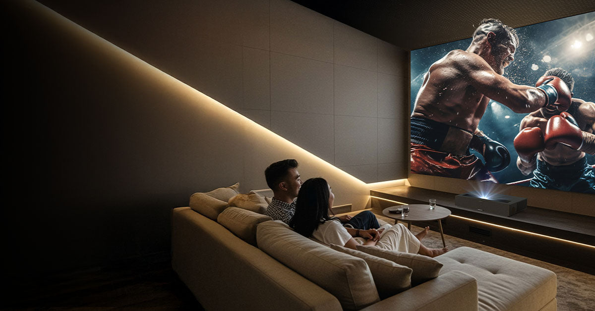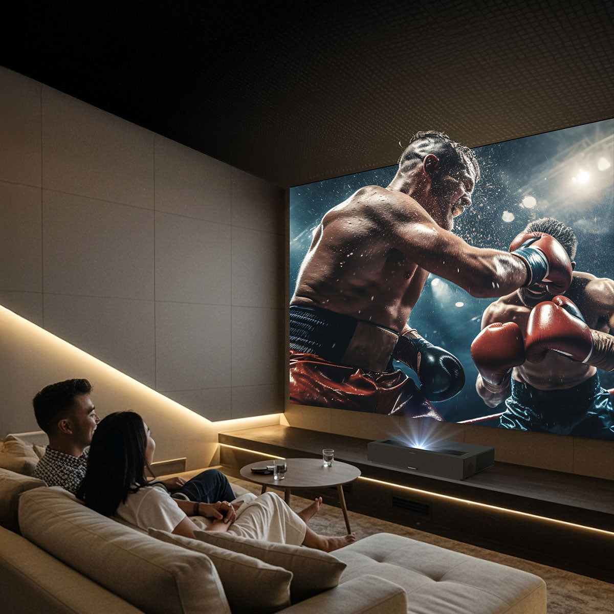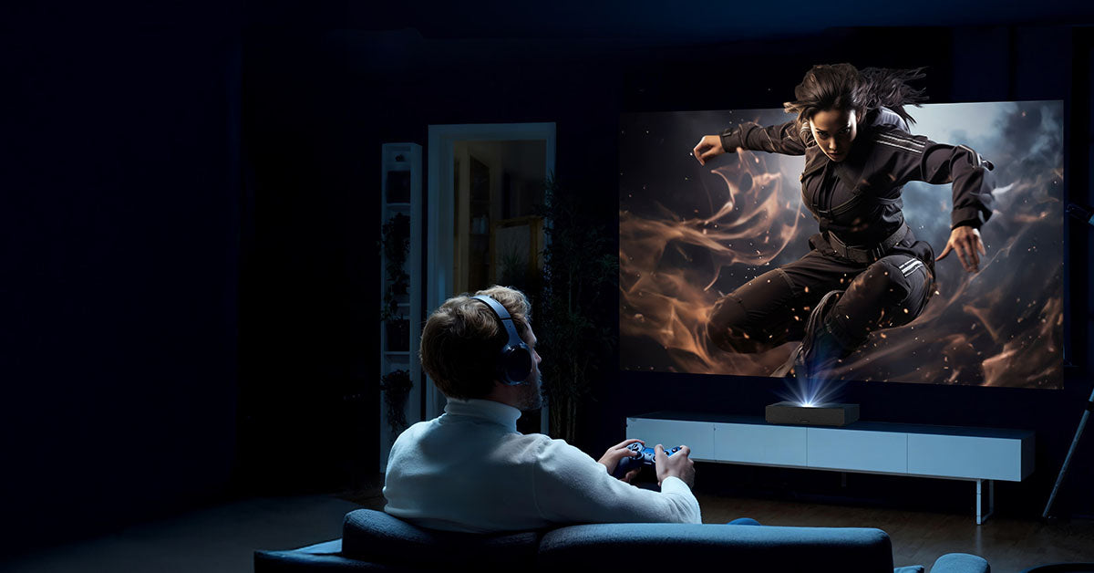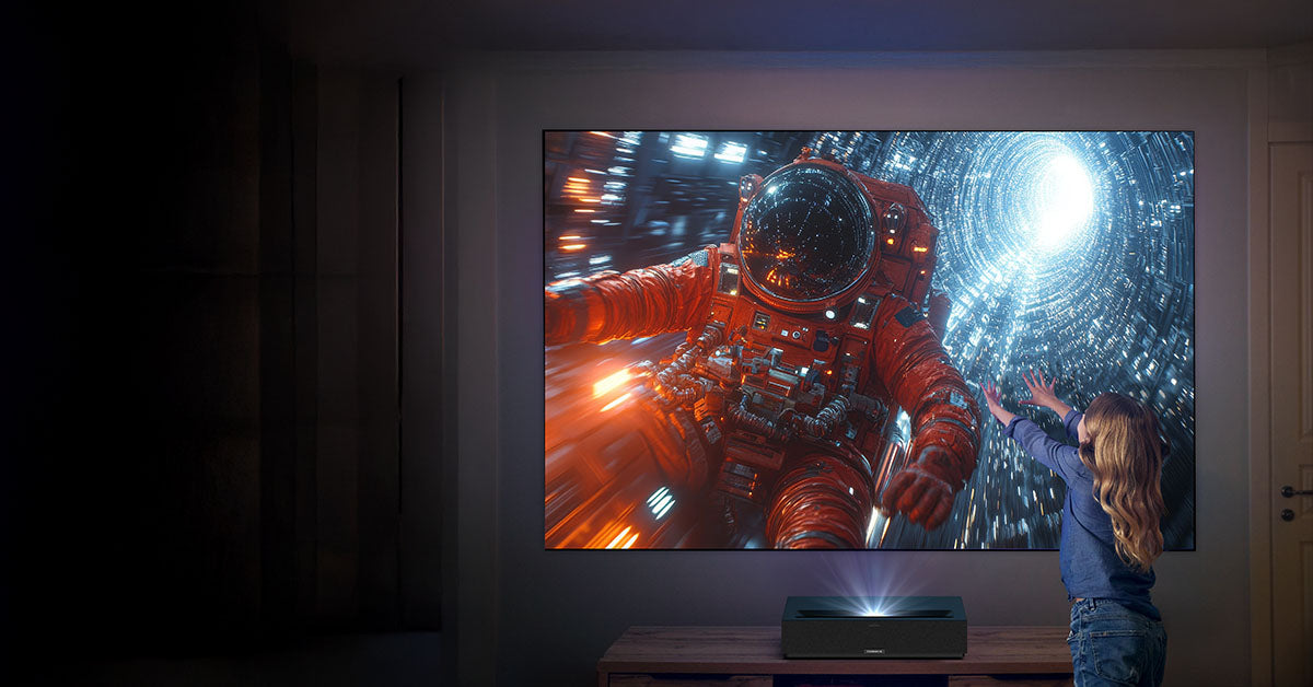 “Transform any room into a personal cinema with 4K clarity, vibrant factory-calibrated colors, and 2200 ISO Lumens brightness. ALPD RGB+ 4.0 ensures smooth, natural visuals for an immersive experience.”